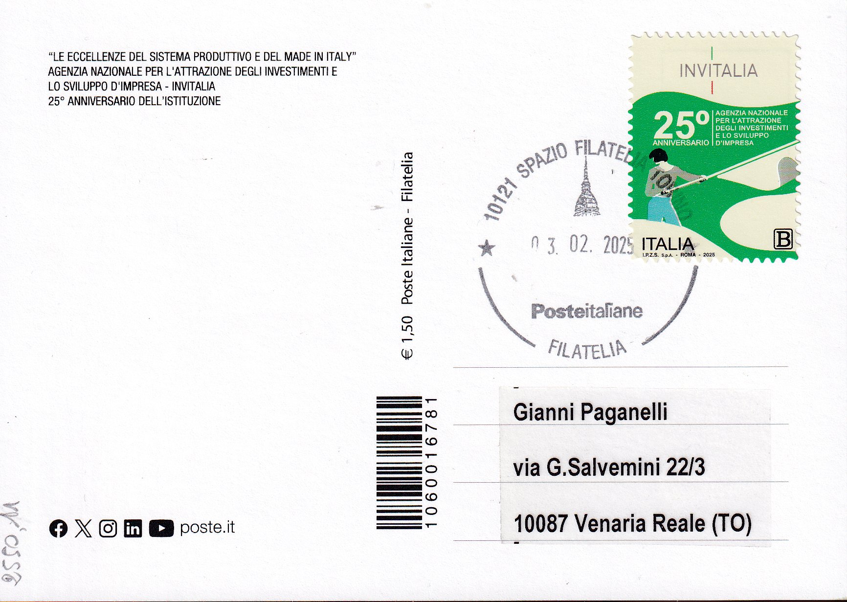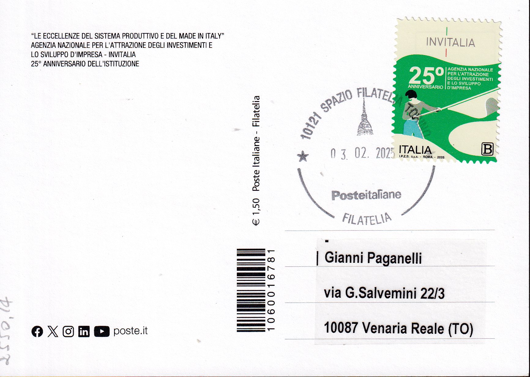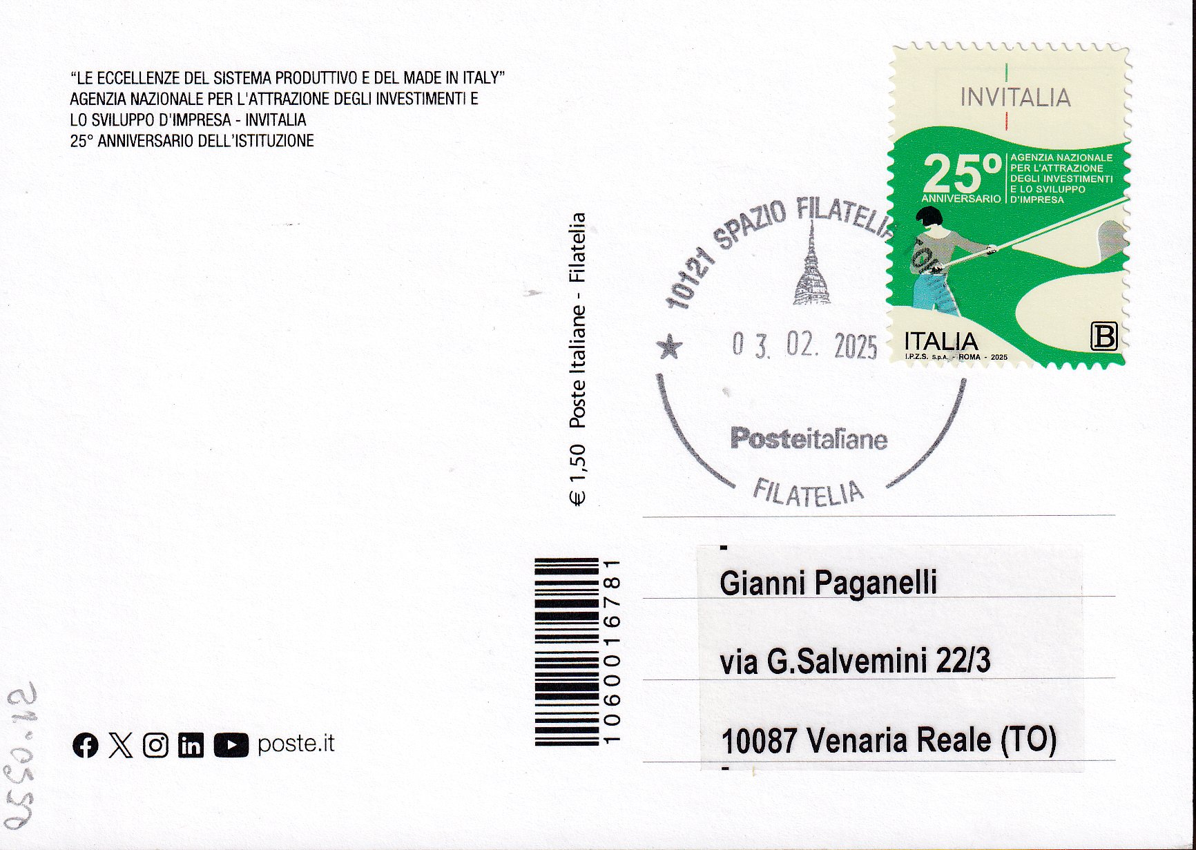 | CAB2570 | v02 | 1/1 | 25-mar-25 | privato | F.D.C.(Cart.) | p | Lucianao Manara | [a fronte dittico con logo MIMIT - a retro CAB-sb ] | or | or | + | i | 10121 Spazio Filatelia Torino - Filatelia | [cart. Poste CAB16893] | 1 | 1 | ||