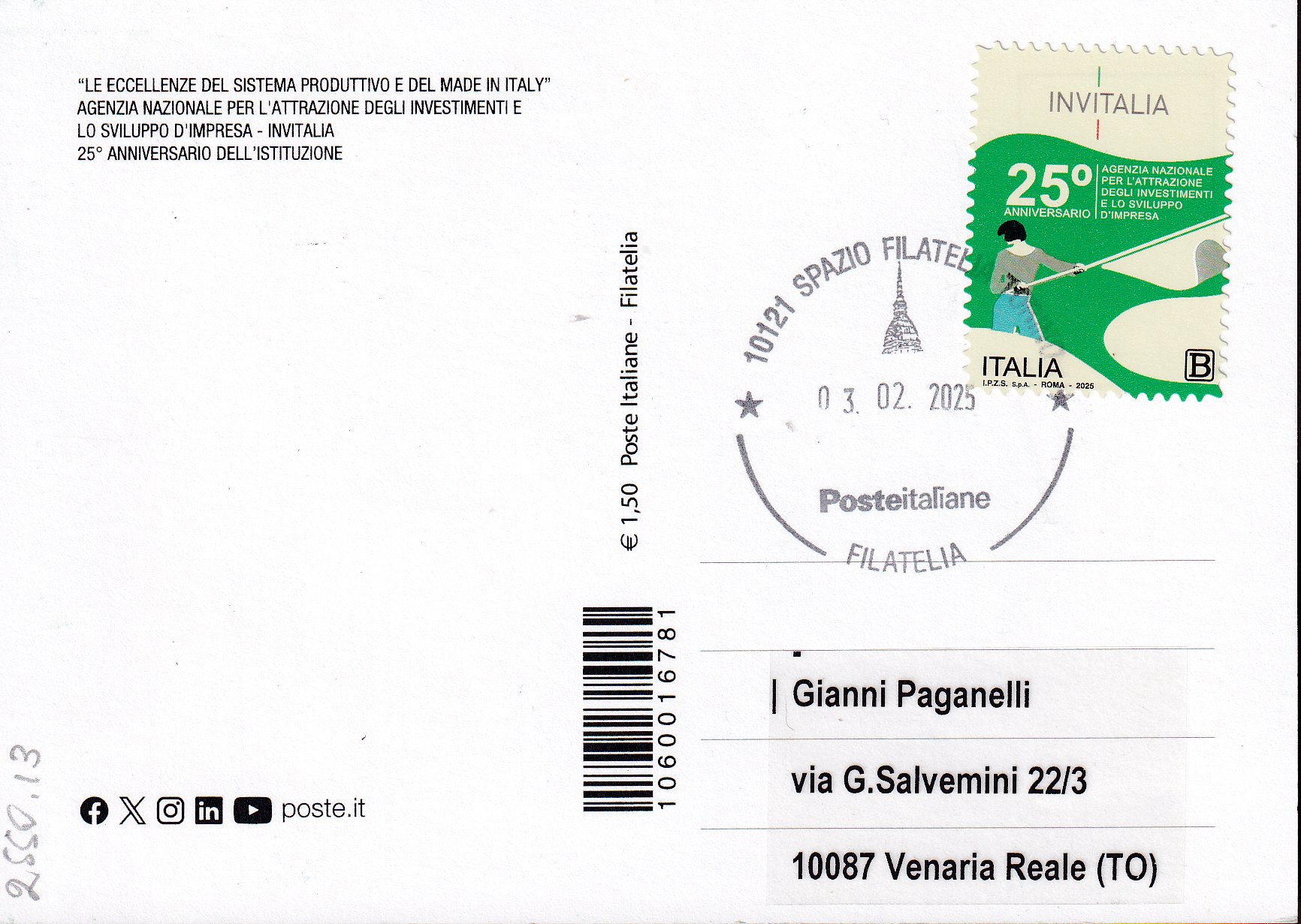 | CAB2567 | v02 | 1/1 | 13-mar-25 | privato | F.D.C.(Cart.) | p | Sergio Ramelli | [a fronte dittico con logo MIMIT - a retro CAB-sb ] | or | or | + | i | 10121 Spazio Filatelia Torino - Filatelia | [cart. Poste CAB16870] | 1 | 1 | ||