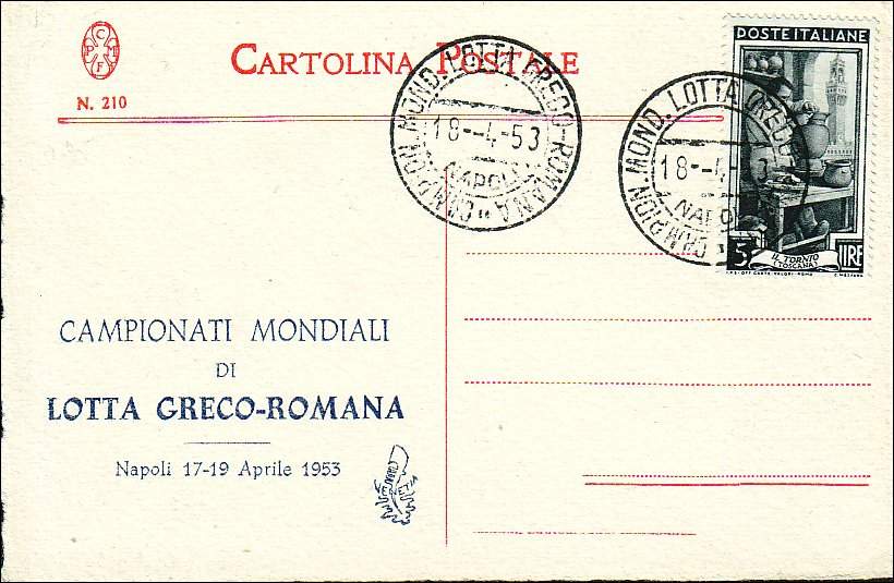 | I | CMM1530418 | v01 | 1/1 | 18-apr-53 | Campion. Mondiale lotta greco romana | 5(637) | sp | or | - | n | Napoli - Campion.Mond.Lotta GrecoRomana | a0-000.0-fst.5 | 1 | |||