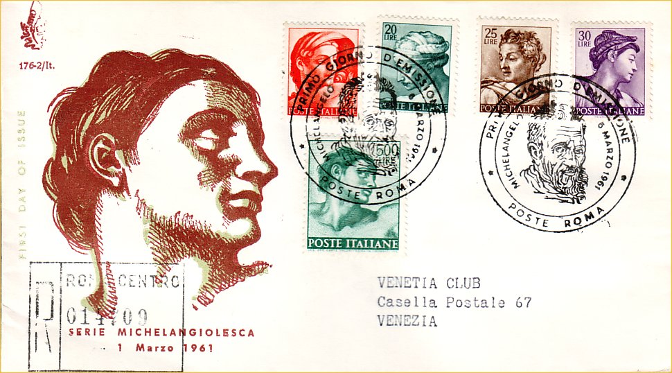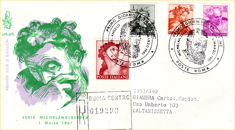 | I | Michelangiolesca | 06/03/1961 | VeCb | 176 | v01 | 4/4 | 70 , 85 , 90 , 100 , 150 (Gioele) | sp | or | - | n | Poste Roma - Michelangelo | [nr.tiratura in rosso] | d | c8-101.2-fsy.4 | * | b.fdc | 1 | |