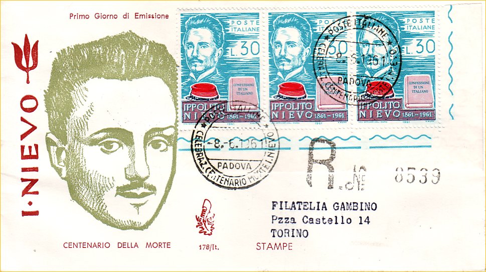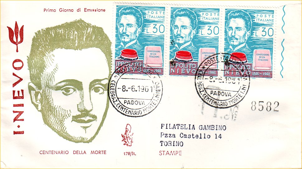 | I | Nievo | 08/06/1961 | VeCb | 178 | v08 | 1/1 | 30-30-30 | sp | r4 | - | i | Poste Italiane - Padova - Celebraz. Centenario Morte I. Nievo | c5-105.1-fsy.4 | qb | b.fdc | 1 | |||
